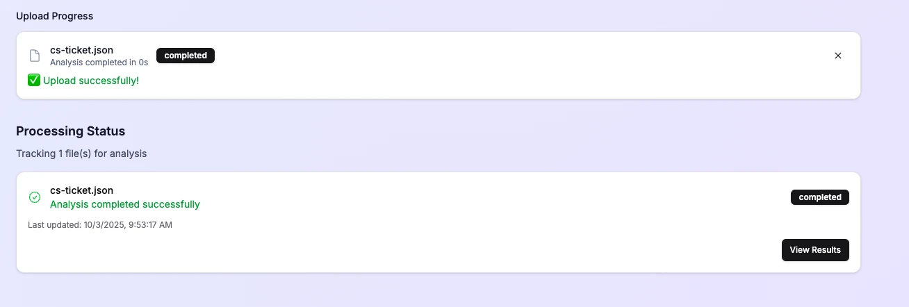 Drag and drop your customer feedback files (emails, surveys, support tickets) directly into the application. We support common formats like Excel, CSV, and text files, and all data is handled with enterprise-grade privacy protection.