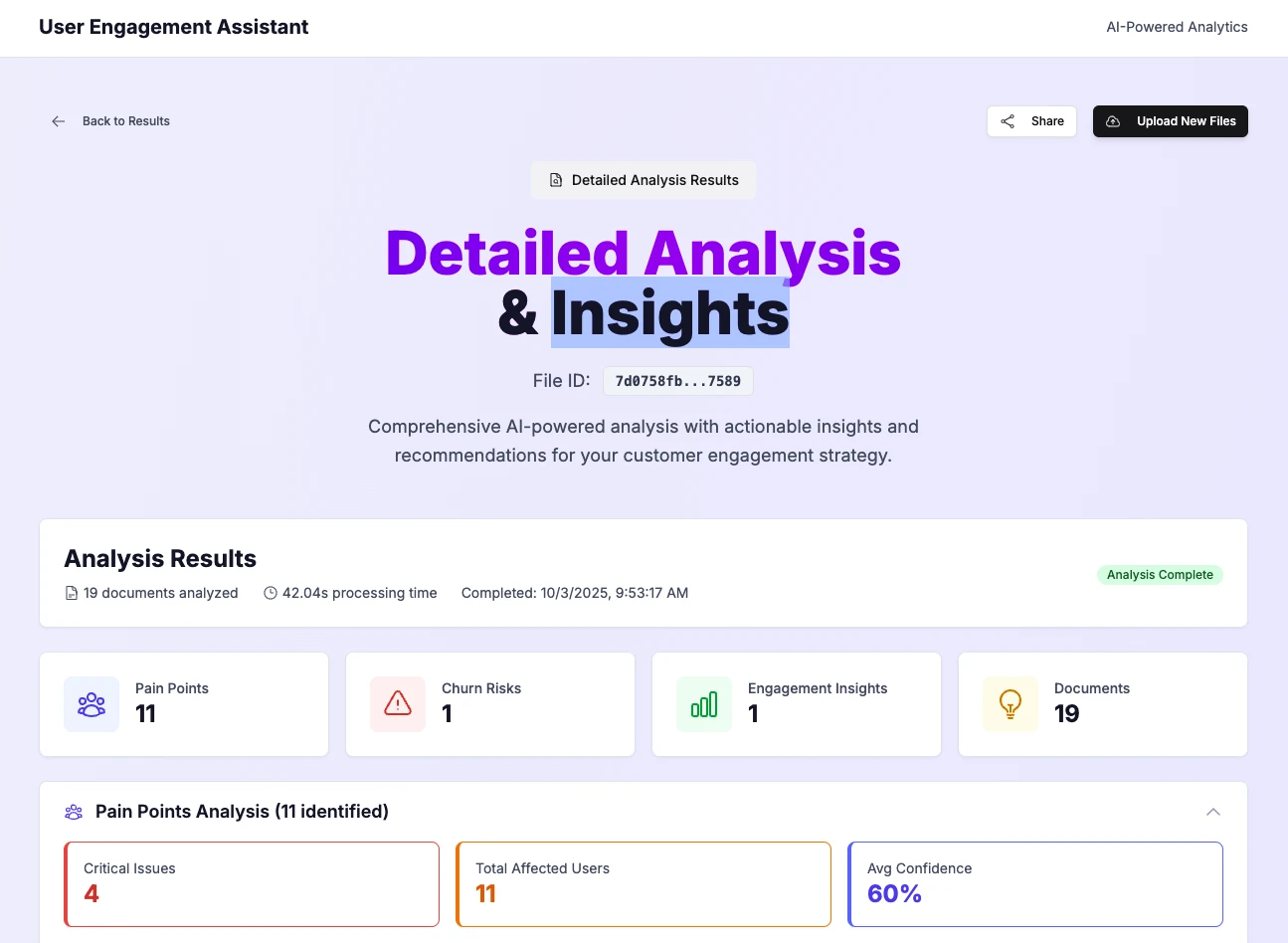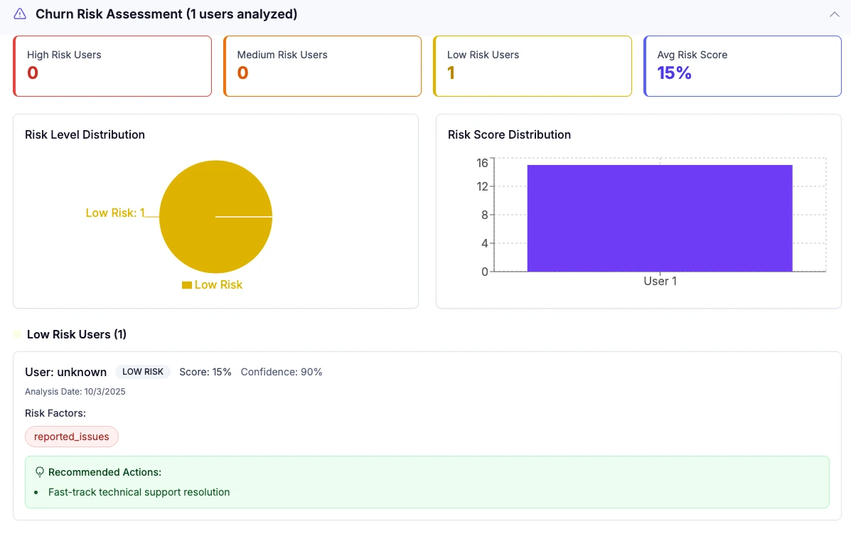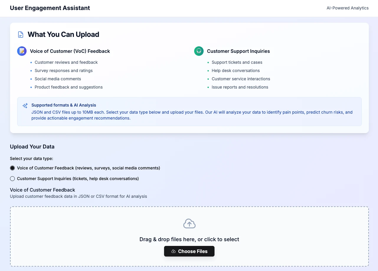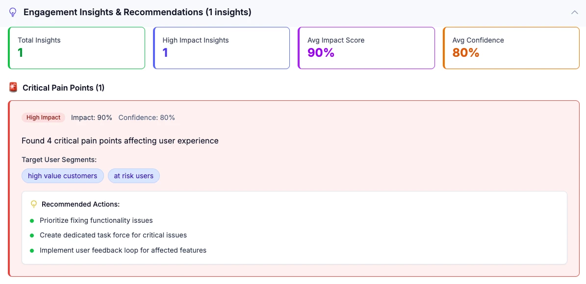 Our answer was the User Engagement Assistant: an AI-powered analytics platform that ingests raw customer feedback and automatically surfaces critical insights. It identifies customer pain points, predicts churn risk, and even suggests concrete actions to improve the user experience.
