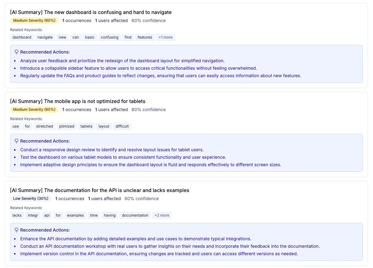 Once the pain points were identified, we aggregated them and calculated severity and frequency scores. But we didn't stop there. We used a PainPointActionsAgent to generate concrete, actionable suggestions for each major issue.