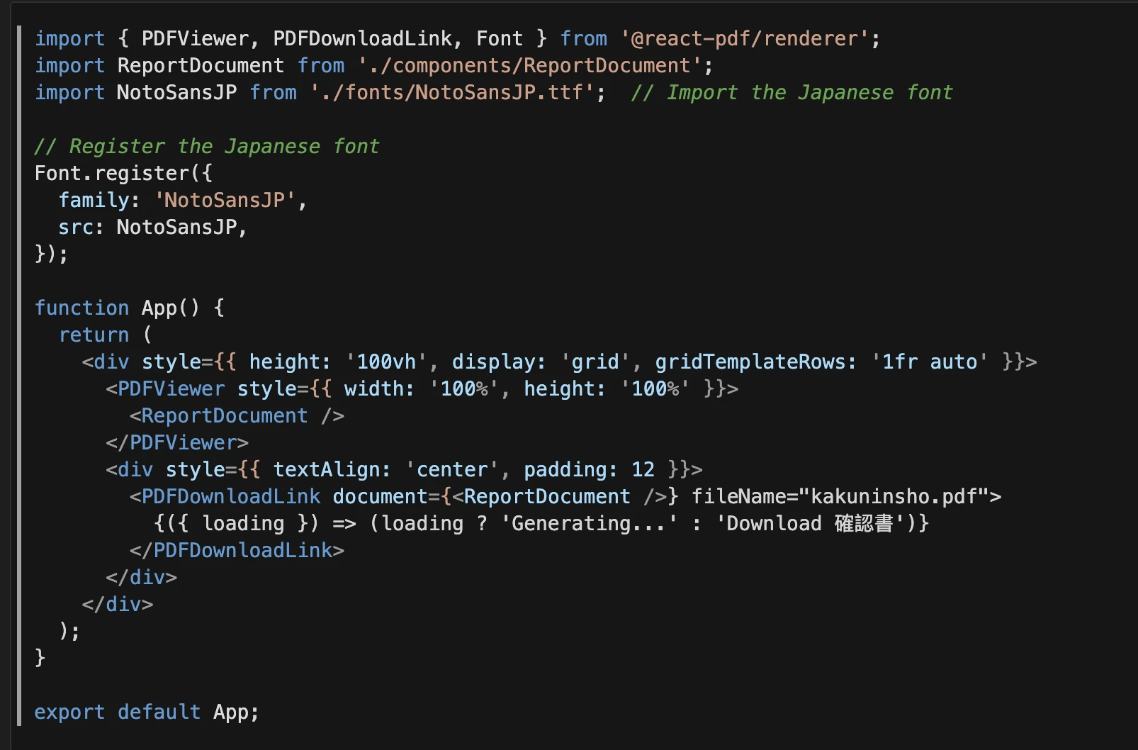 Let’s build a practical example: a Japanese business form (確認書) using React PDF Renderer. This example shows how to: