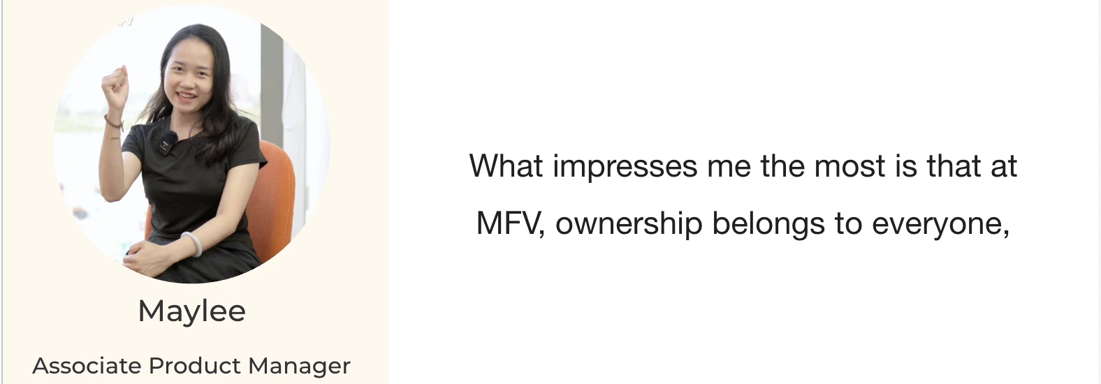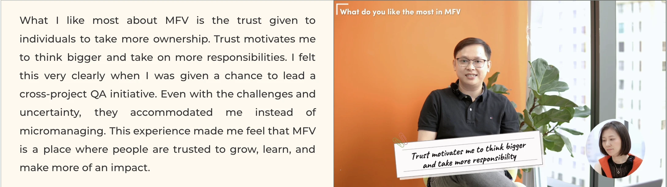 So, once again, thank you very much to the members for sharing your thoughts in this video. The stories you shared remind me that MFV is not just a workplace; this is a place for the community to synergize, connect, support each other, and then grow together. This is what I really want to make happen even more at MFV. Thank you for watching this video. Let's make it together!